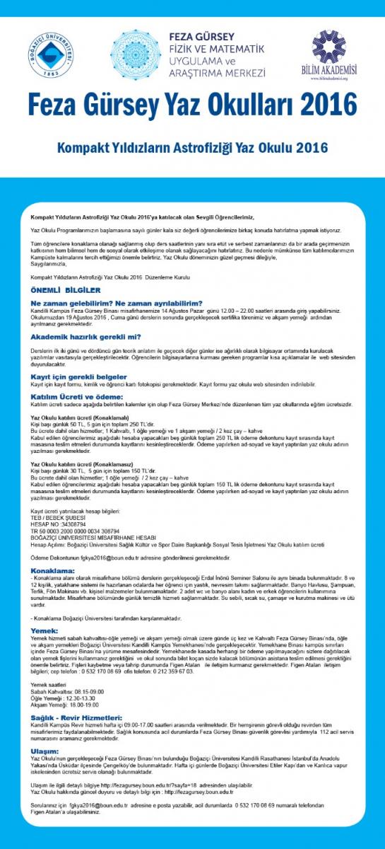 Boğaziçi Üniversitesi Feza Gürsey Enstitüsünde Ağustos ayında düzenlenecek olan Kompakt Yıldızların Astrofiziği Yaz Okulu'na yaptığınız başvuru için sizlere çok teşekkür ederiz.
