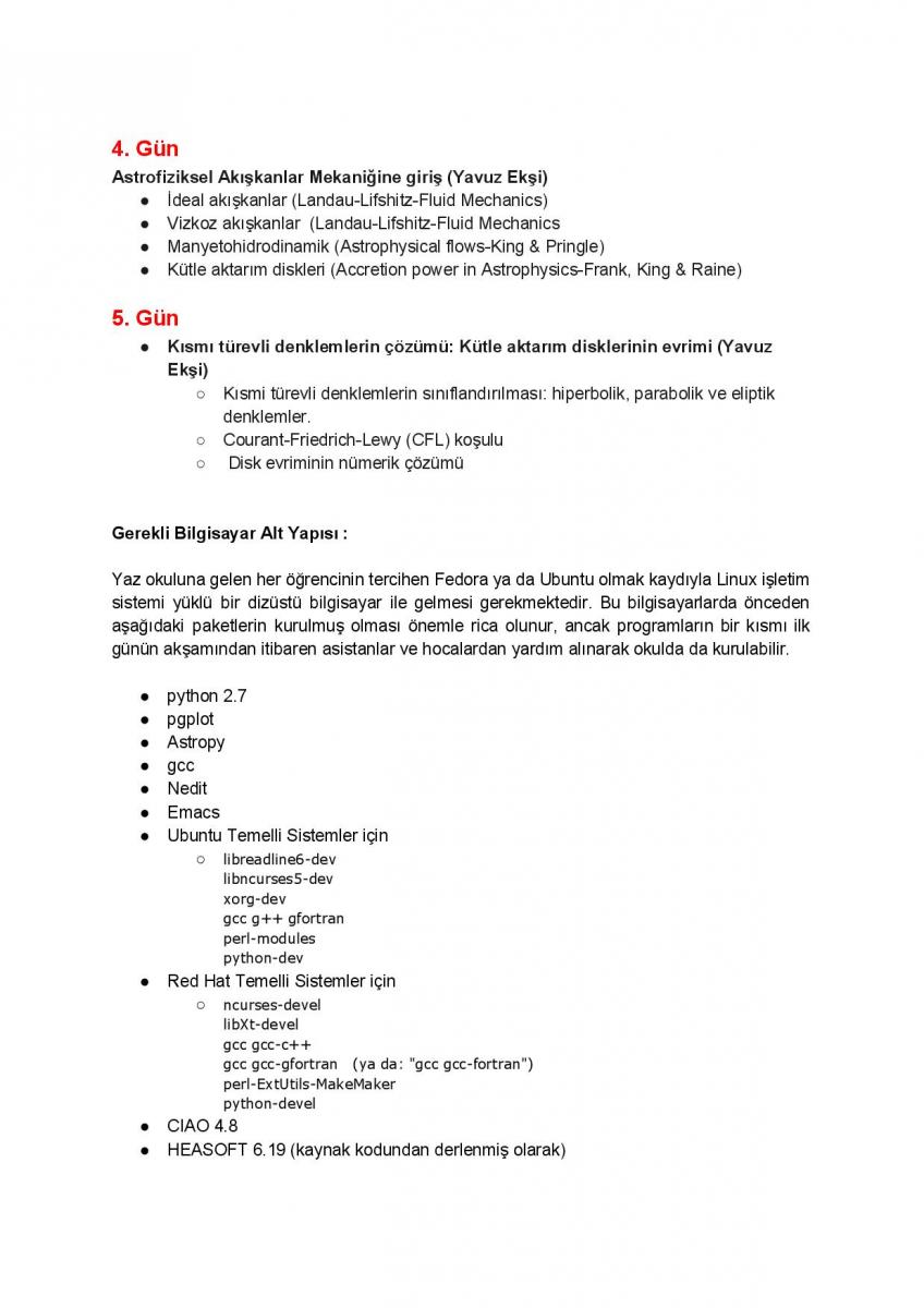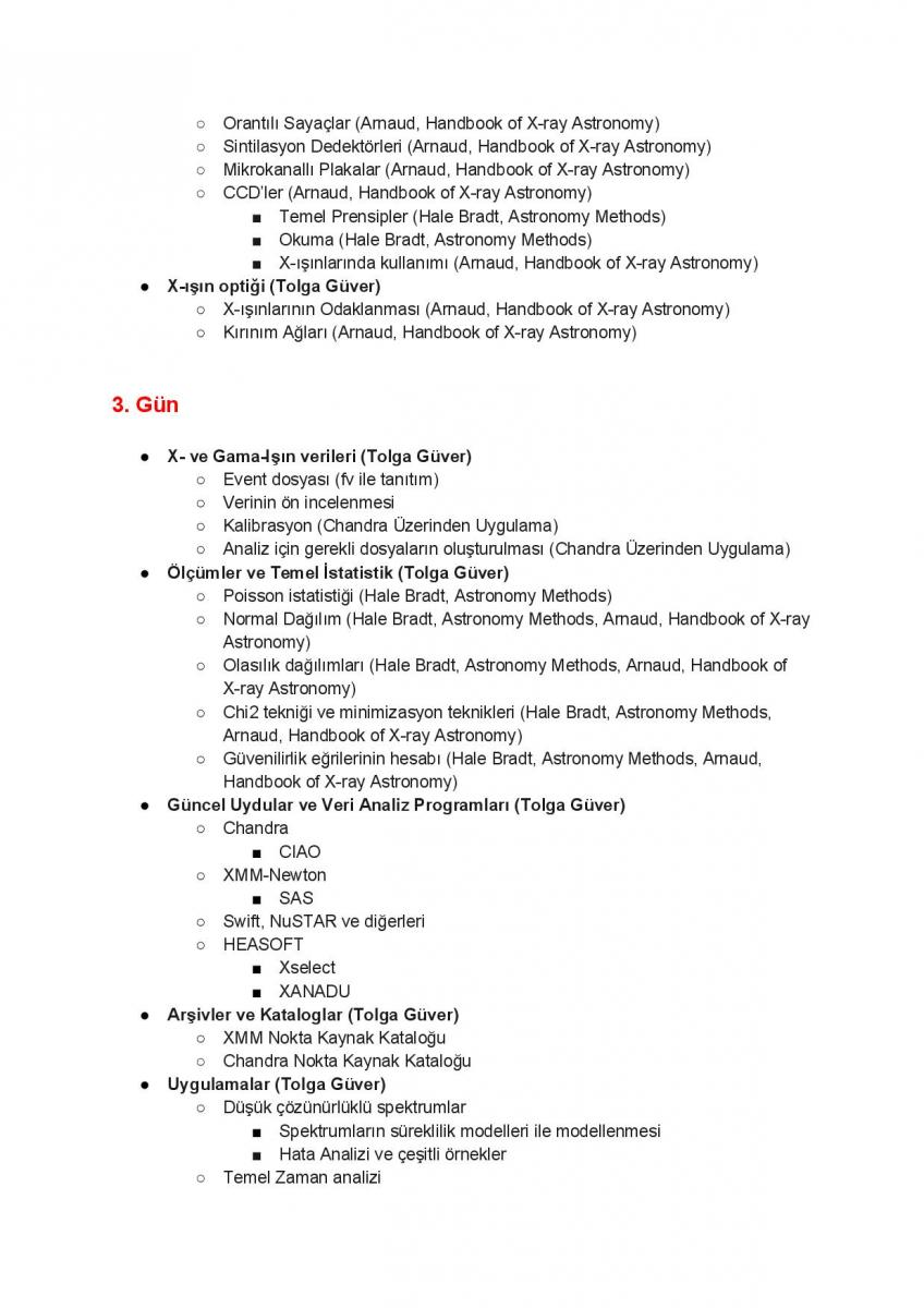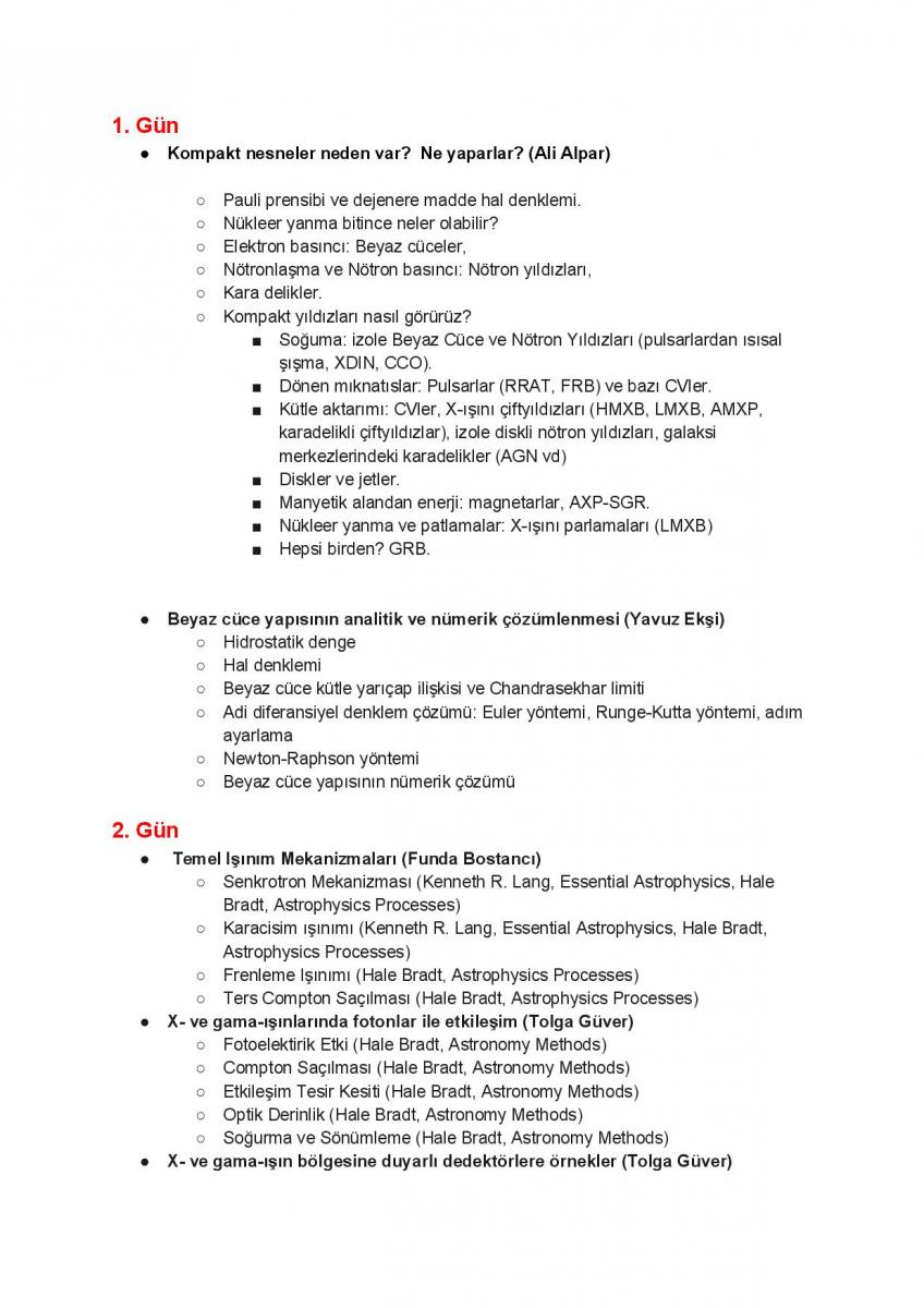 İlk iki gün Kompakt cisimlerin astrofiziksel görünümleri ve fiziğine giriş. İkinci gün, radyatif süreçler ve X- ve gama-ışınlarında fotonların tesbiti ve bu enerjilerdeki temel gözlem aletlerinin tanıtımı. Üçüncü gün gözlem verilerinin tanıtımı, örnekler ile veri indirgemesi ve analizi. Örnek bazı kaynakalara ait verilerin arşivlerden çekilerek analiz edilmesi, tayfsal ve zamansal analiz. 4. ve 5. gün Akışkan mekaniğine giriş ve nümerik yöntemler.